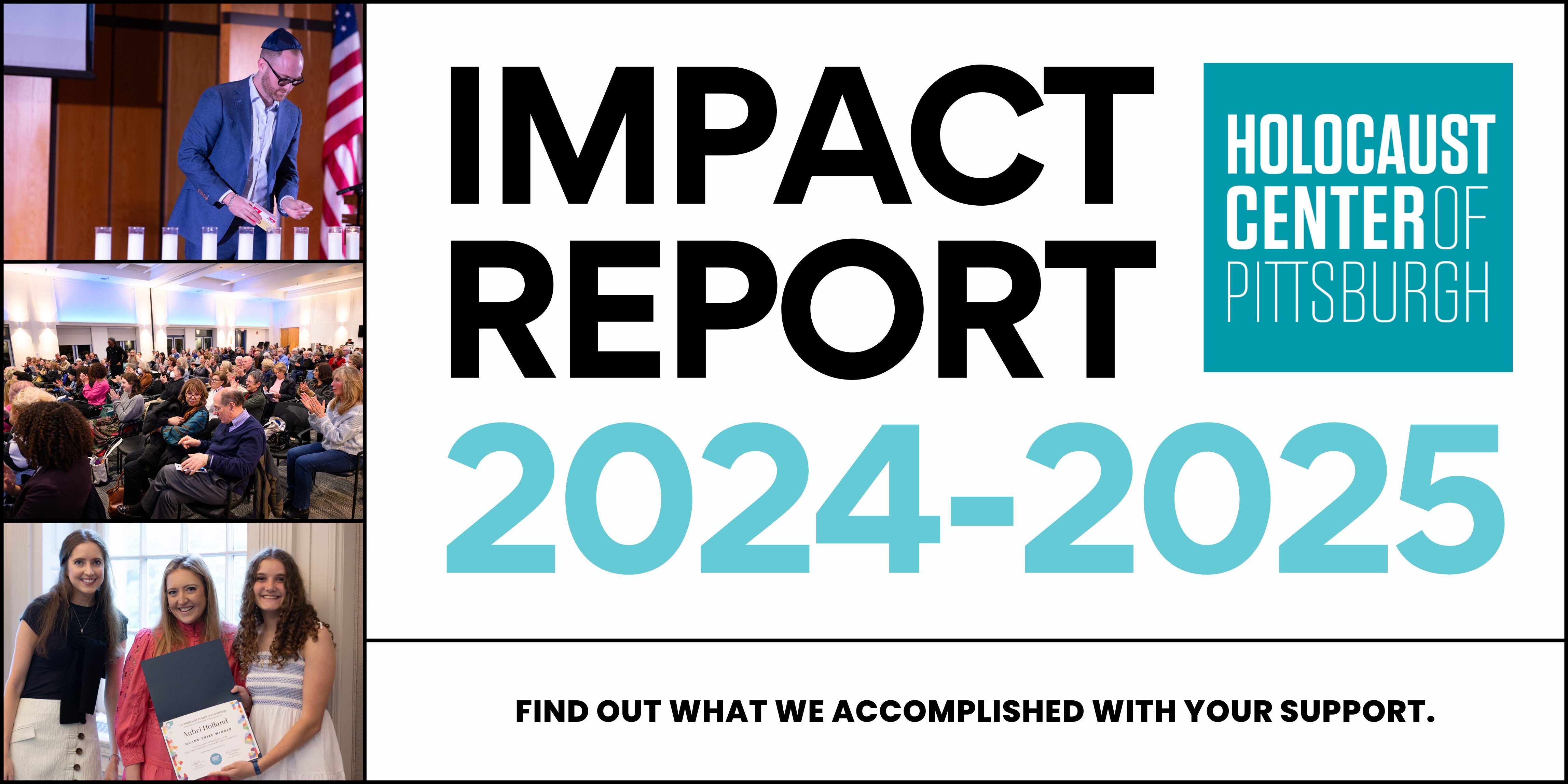 Copy of Website Slides (6)Copy of Website Slides (9)Revolving Doors75Events Upcoming Events Read More Generations Programs Read More Giving to the Center Read More CHUTZ-POW! Read More Revolving Doors Read More Waldman International Arts and Writing Competition Read More Upcoming Events Aug 20 August 20, 2025 – January 30, 2026 “Camera as Passport” Exhibit Dec 7 5:00 pm – 6:00 pm Holocaust Education Girl Scouts Patch Program Public Launch Event Dec 11 8:30 am – 2:30 pm Teaching the Holocaust Through Literature Jan 29 9:00 am – 3:00 pm Professional Development Workshop with Emily Loeb & Kate Lukaszewicz View Calendar Past Programs and Uploads Holocaust Center Pittsburgh The Holocaust Center of Pittsburgh connects the horrors of the Holocaust and antisemitism with injustices of today. Stay up to date by signing up for the Holocaust Center of Pittsburgh Newsletter! Enter your information below to subscribe. First Name Last Name Email address: Leave this field empty if you're human: Instagram Facebook YouTube WordPress LinkedIn