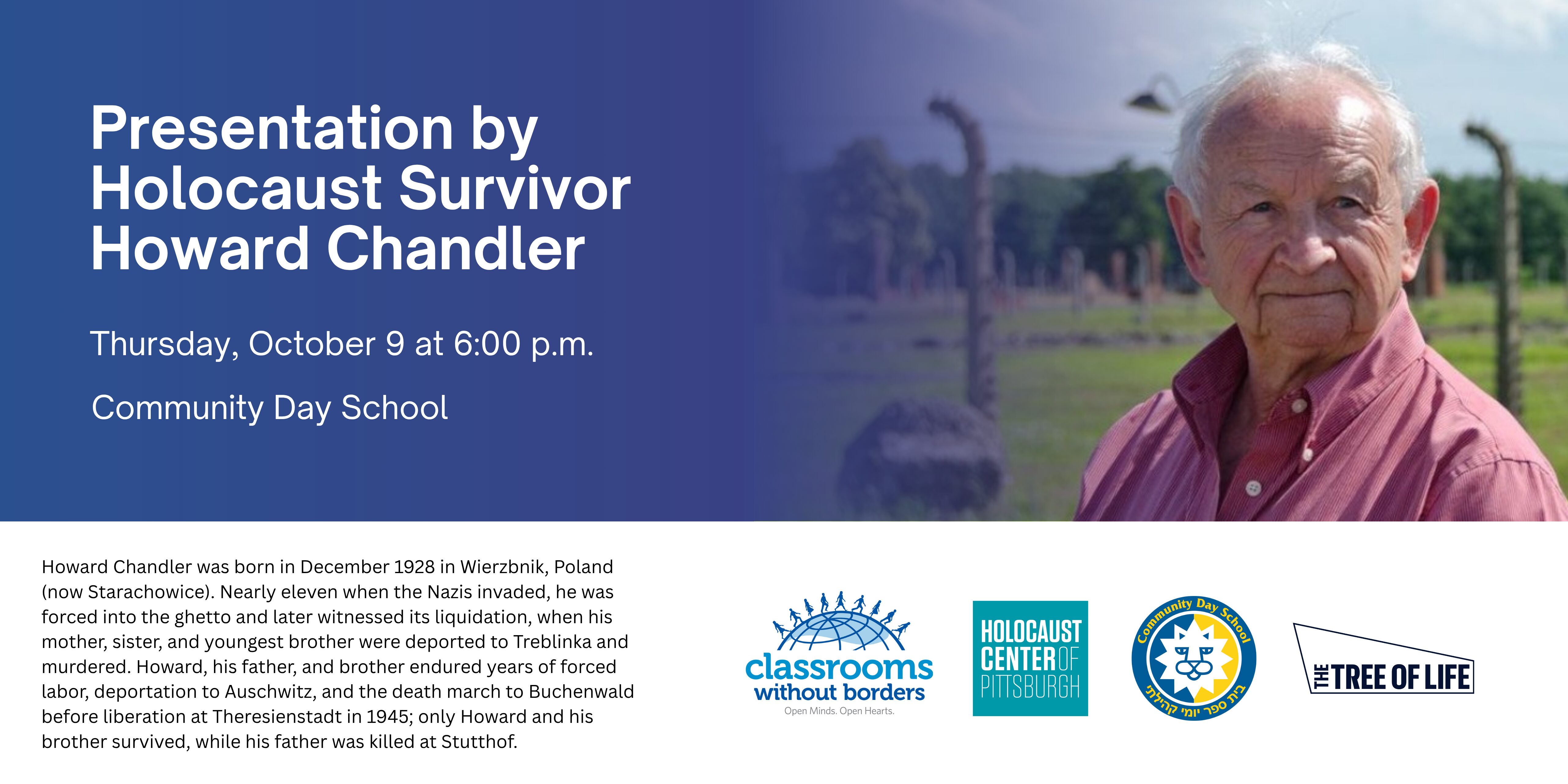 Join Classrooms Without Borders, the Holocaust Center of Pittsburgh, and Community Day School on October 9th for a presentation by Holocaust survivor Howard Chandler.