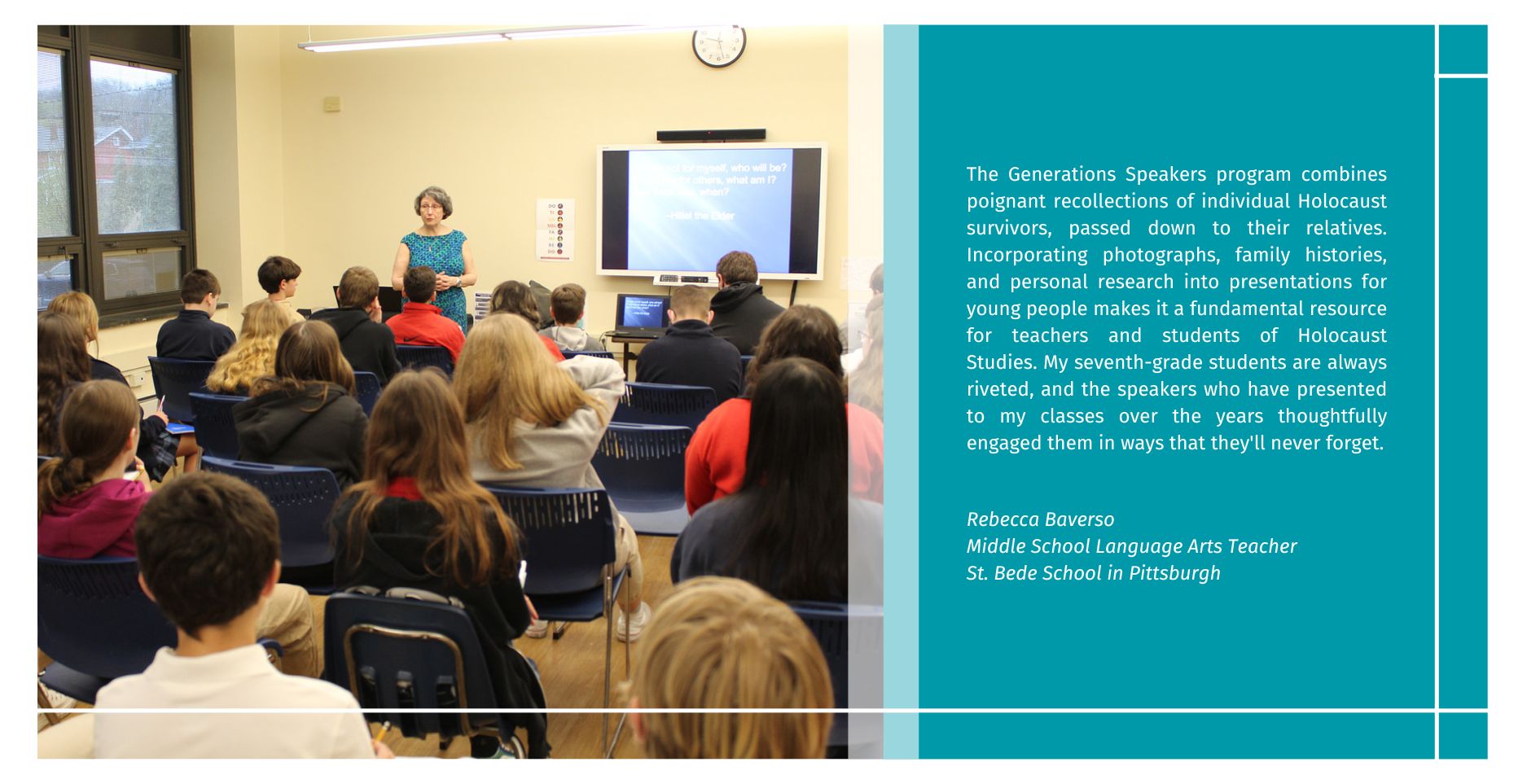 We are happy to make the Generations Speakers Bureau talks free to all K-12 schools and degree-seeking university classes requesting a speaker! However, if you or your school feels moved to make a donation in any amount, we would be grateful to accept whatever you can give. If you would like to provide an honorarium or donation, please contact Christina Sahovey at csahovey@hcpgh.org.