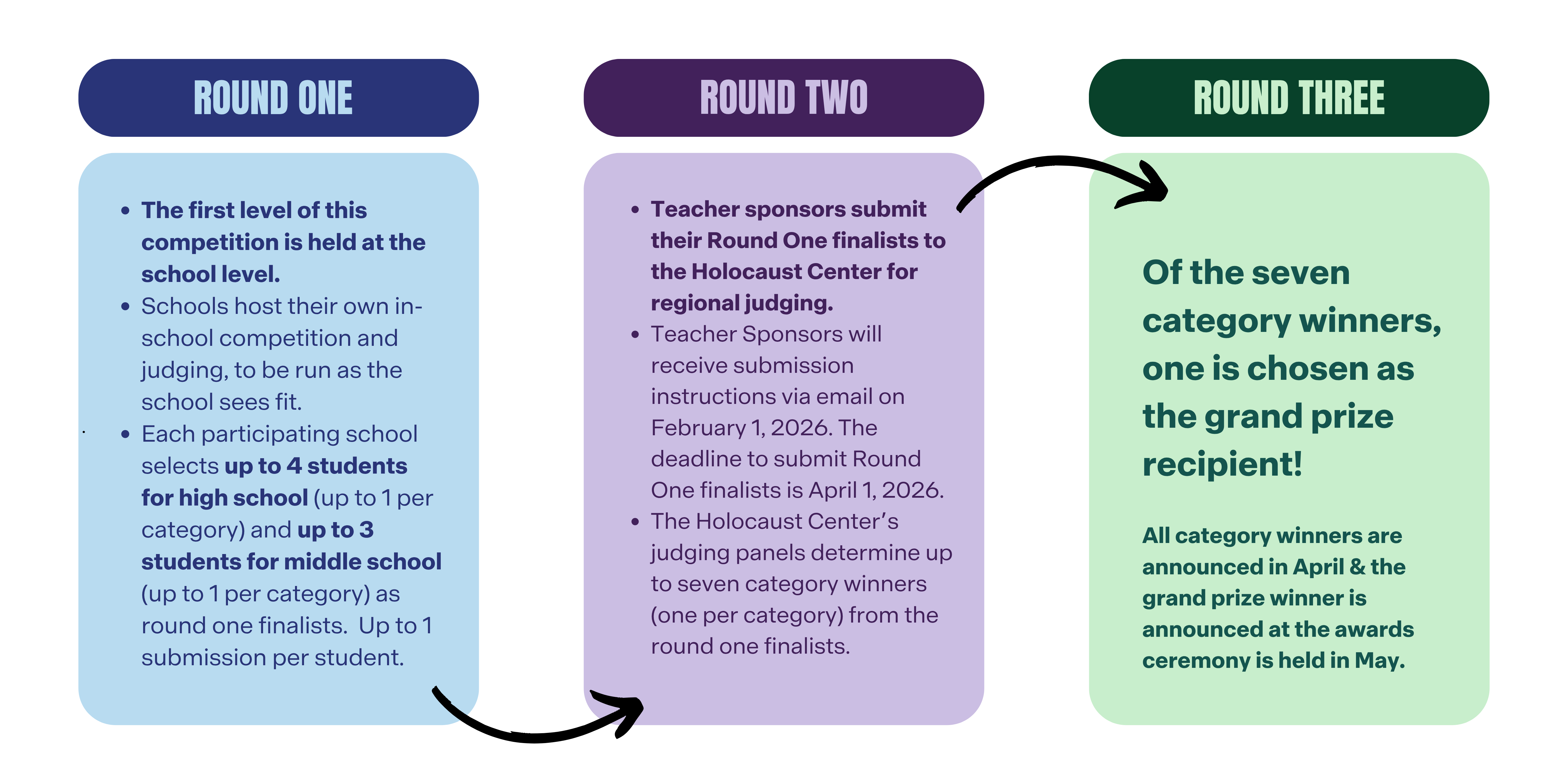 We are continuing the three-round format, in which you – the teachers and students – have the opportunity to be recognized in our three rounds of judging! Each school has one “Teacher Sponsor” who oversees the school’s first round competition, submits the school’s finalists, and communicates with the Holocaust Center. Any time between now and December 20, sponsors sign their school up to participate for free. A public-facing list is made available to show which schools are participating. Participation is limited to schools located in Pennsylvania, eastern Ohio, and West Virginia.